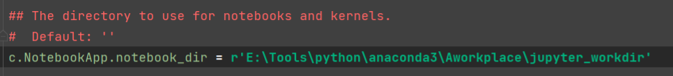 - 打开配置文件,jupyter_notebook_config.py,里面的内容默认全部注释掉,例如想要修改默认打开的本地目录,找到 c.NotebookApp.notebook_dir