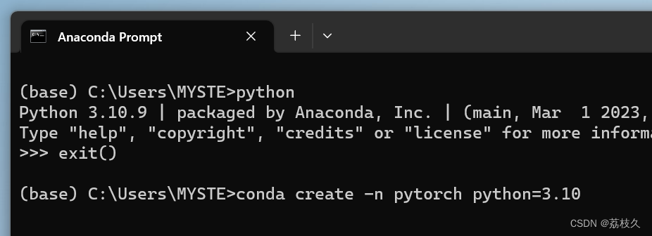 创建pytorch虚拟环境,pytorch是环境变量的名字,python=3.10即是之前自己系统python版本。(注意这里的python版本要和自己的版本相同,我的是python3.10)