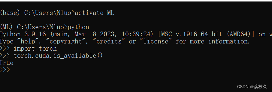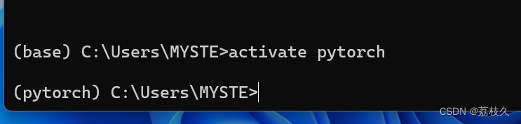 我们输入activate pytorch(pytorch是你定义的这个环境的名字),左边的环境就从base(基本环境),变成了pytorch环境。